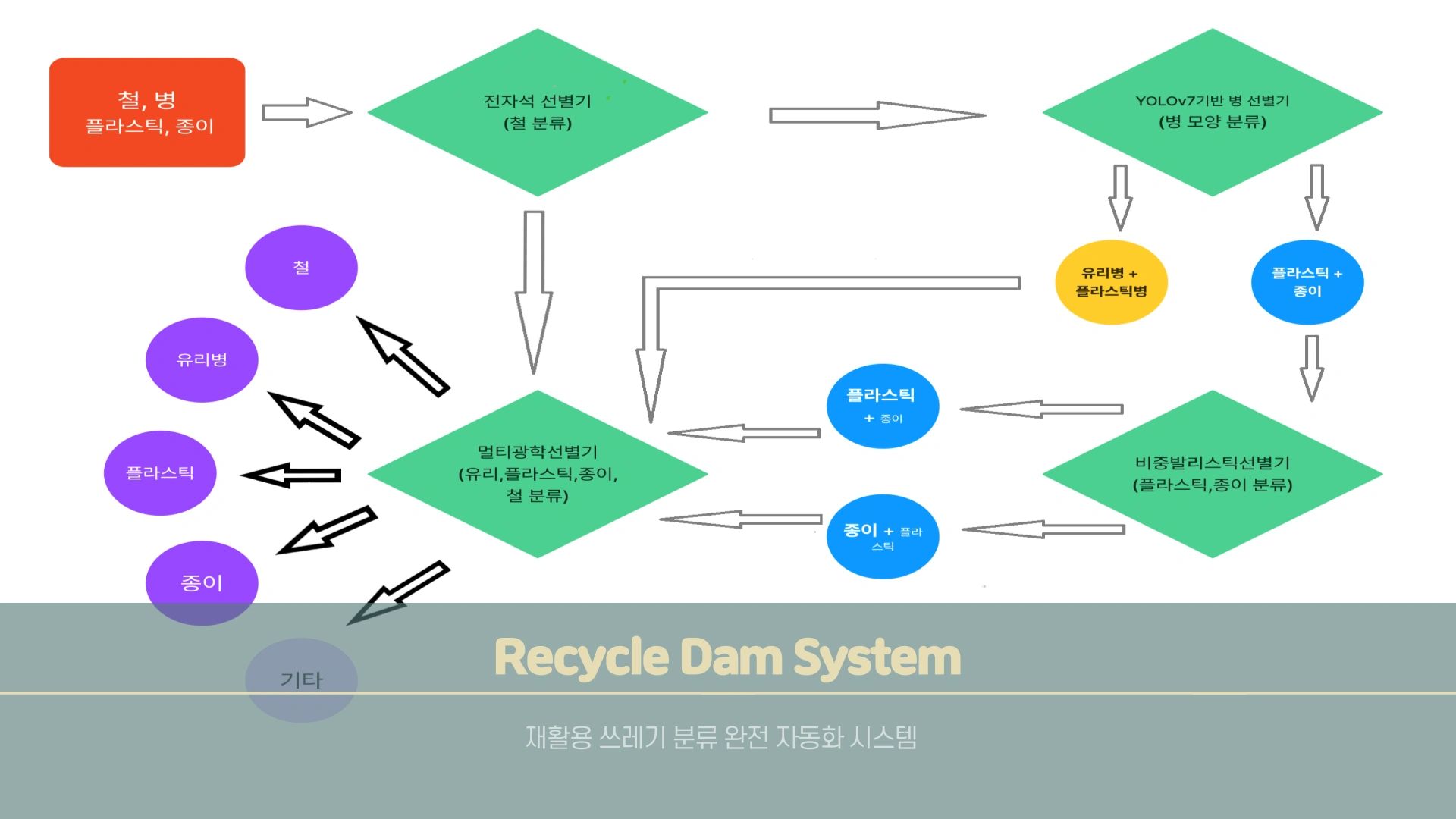 "Re-Dam" is an automated recycling robot sorting system that uses a Raspberry Pi and a YOLOv8 model. It analyzes objects placed on a conveyor belt through a camera to automatically sort them by shape, color, and size. Based on this information, a robotic arm then directly sorts the waste.